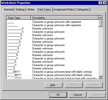 Use Administration>Worksheet Properties >Assignment Rules to define the rules that map a data item to a data type. This dialog also controls automatic data type allocation: