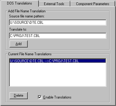 The DOS Translations tab enables you to map DOS drives, directories, and file names to other file names and directories. This feature is useful when a project has been built on a drive that appears to have different logical paths to different users. For example, if a project has been built on one user's workstation where the source files are located on a logical path beginning with U:\SOURCE\DTE.CBL and those same source files are stored on a second user's workstation on the logical path C:\PROJ\TEST.CBL then a file name translation can be used to map the original settings to the secondary user's parameters.