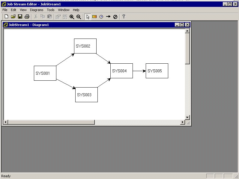Click New to create a new diagram. Selecting this option opens a new child window within the Job Stream Editor. For example, if you start with following diagram: