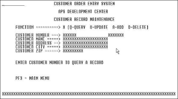 One occurrence of data at a time. For example, your screen might display the name, address, and other information about a particular customer, as shown in Screen Displaying One Occurrence of Data. To query the record in this example, the end user enters q(uery) in the Function field and a value in the record key field, Customer Number. The developer has assigned the S(end) function to the PF3 key so that the end user can press PF3 to display the Main Menu.