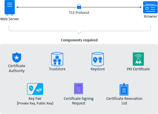 You mus secure the communication channels between servers and clients to protect your data and stop security breaches from happening in your environment. The following graphic depicts the different components required for secure communication using certificates, PKI, TLS, and tools to manage the keys.