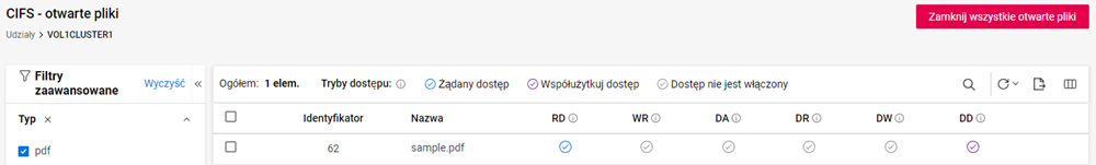 Widok tabeli: Lista połączeń NCP i CIFS.