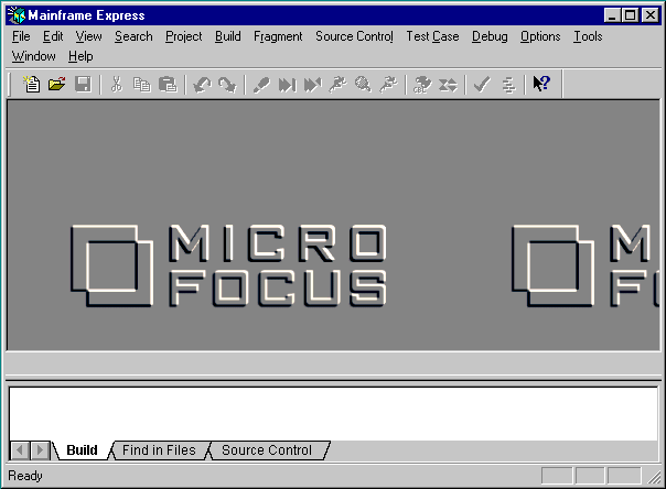 The large pane is where various windows such as project windows and editing windows will be opened. The pane below it is the Output window, where messages from the IDE and compiler are displayed. It has two tabs marked Build and Find in Files. When the Build tab is highlighted (that is, white), this window displays messages to show the progress of a build. When Find in Files is highlighted it displays the results of the multi-file search function.
