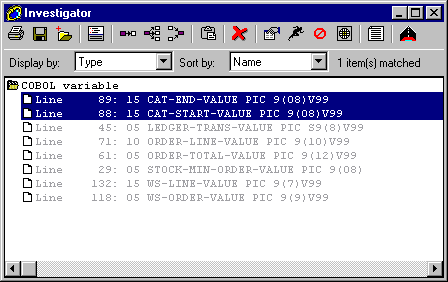 The matching results are displayed. These items all correspond the name criteria *VALUE. Depending on the Display Format that is selected in the Utilities > Options... > User tab, detail may be abbreviated or extensive.