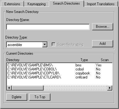 The Automatic Component Locator (ACL) uses search directories to locate and load referenced project components. For example, notice in the figure above, c:\revolve\sample\cobol\ is defined as a search directory for COBOL files. During the parsing process, a JCL references a file named BATCH1.CBL. When the parser encounters the reference, it deploys the Automatic Component Locator to the search directories defined for COBOL. If BATCH1.CBL is contained in c:\revolve\sample\cobol\ then it is loaded and parsed into the project. This functionality helps you automate some of the project creation process.