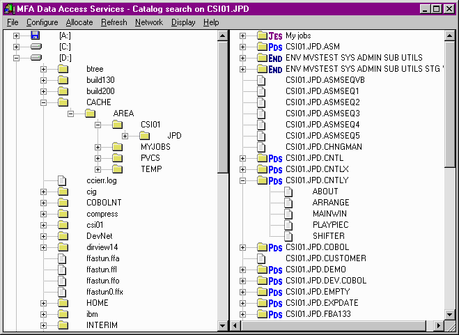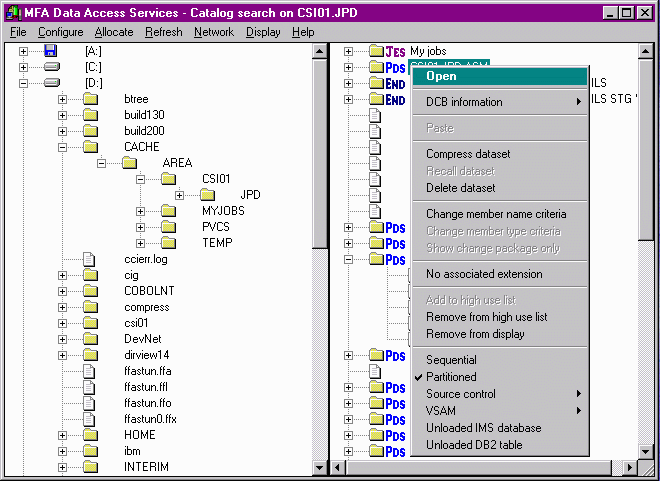 To expand a workstation drive, workstation directory, mainframe partitioned data set, or mainframe source code control system data set and see the list of files or members within, simply double click on the item with the left hand mouse button, or press the + sign at the start of the line.