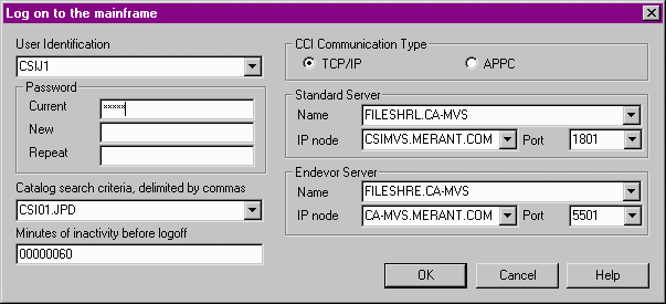 Each time you start Drag and Drop, you are prompted for your mainframe user id and password. For security reasons, the password is not stored on the workstation. You can also alter the mainframe catalog criteria to search for. This criteria can be a fully qualified name, a partial name, or a name that contains an asterisk for additional matching possibilities. If you do not provide any catalog search criteria, you will be prompted for one. The last twenty catalog search criteria items are kept, and may be selected directly from the drop down. The minutes of inactivity before logoff field indicates how many minutes must have gone by, without using your Drag and Drop session, before Drag and Drop will log you off the mainframe. You may specify zero to override and not have this happen. Finally, the communication protocol information must be given. Typically, your would enter the name of the MFA server in the standard server name field: the name that the CCI daemon knows the mainframe server as. This would generally be enough, but if you are using APPC, or direct connect TCP/IP to the mainframe without the use of the CCI daemon, then some information must be entered for the server machine parameters.