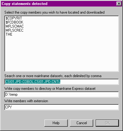 If you import an individual file or member and you have turned on the configuration option scan imported members for copy statements, the imported member is checked for a variety of copy type statements in the COBOL, PL/I, and 370 assembler languages. If the scan detects the presence of copy statements, an additional dialog box is displayed enabling you to import the copy statements from one or more partitioned datasets or source code control systems, separated by commas.
