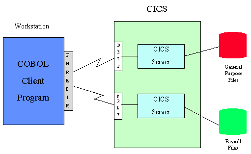 The CICS Mainframe Access environment permits multiple CICS servers to execute within the same CICS region (see Figure 1). Each CICS server must have a unique transaction ID and that transaction ID must consist of three unique characters followed by 'F' (e.g. BETF). Each CICS server executing within a single CICS region behaves as a unique file access provider; thus, programs compiled for transaction processing accessing multiple servers in the same CICS region is permissible.