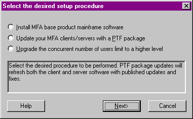 At various times, MERANT will bring out PTF packages for the MFA product line that will include both updates and bug fixes. During the mainframe server installation, you were prompted for your e:mail userid. If you entered it, then you will be automatically informed by e:mail when a PTF package is available. If you did not enter it and you wish to be informed when these PTF packages become available, simply enter your e:mail userid during the PTF package update process.