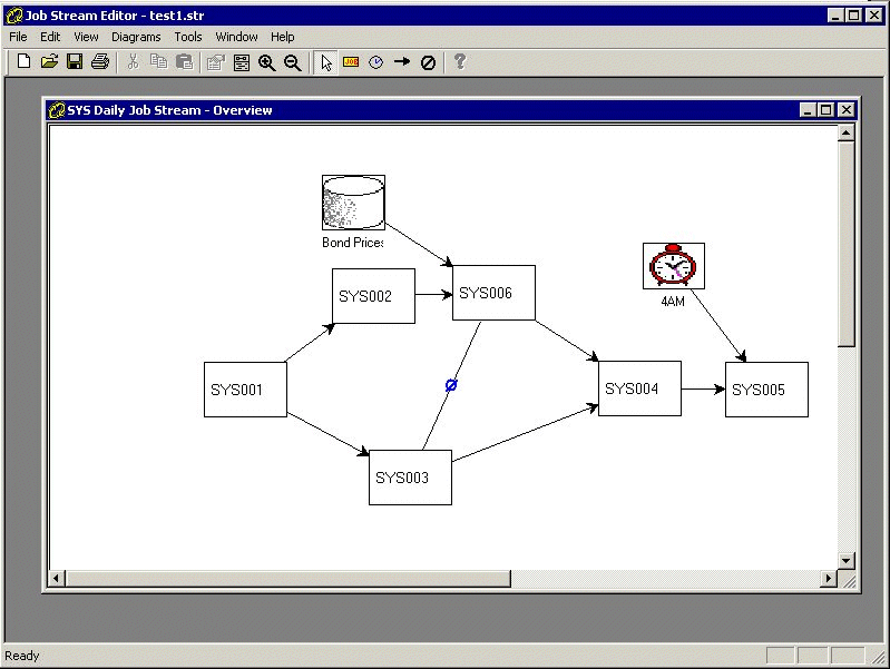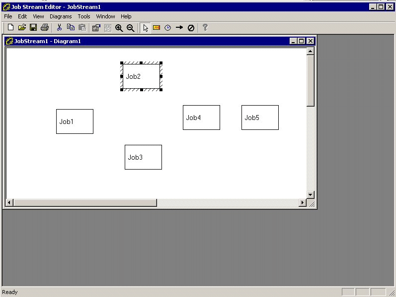 Click New to create a new diagram. Selecting this option opens a new child window within the Job Stream Editor. For example, if you start with following diagram:
