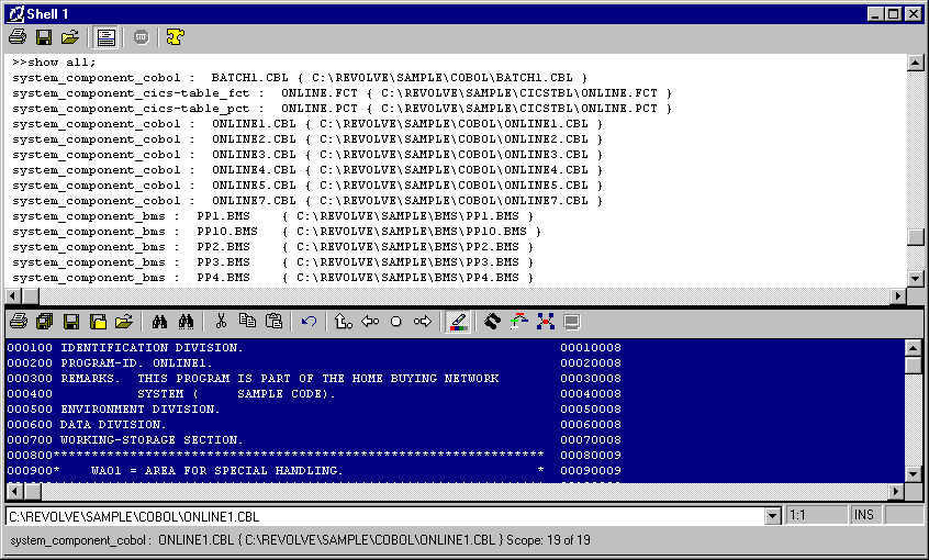 In COBOL source code there are programs, divisions, paragraphs, and statements. The divisions, statements, and other pieces of the source code are known as elements. Elements provide an extremely detailed representation of the source code, including the usage of variables in statements. COBOL constructs are used in many places in a program. For example, a MOVE statement can appear in several places. Each instance is stored in the database as a separate element and can be accessed with Revolve.