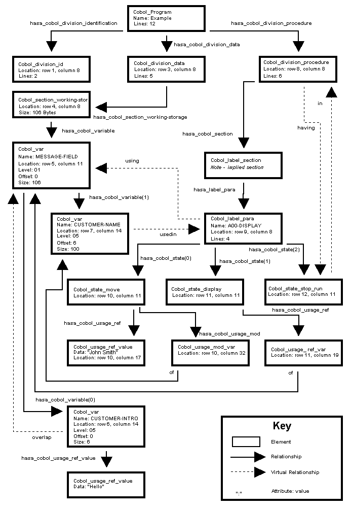 The following diagram represents the parse tree of the test application. The elements of the parse tree are represented by boxes, and the arrows represent relationships. Within each box is a list of the attributes that describe the associated element. For example, the parse tree shows that a paragraph element whose name is A00-DISPLAY, is located at row 9 column 8, and has a length of 4 lines. The paragraph is related to three statement elements with the hasa_cobol_state relationship.