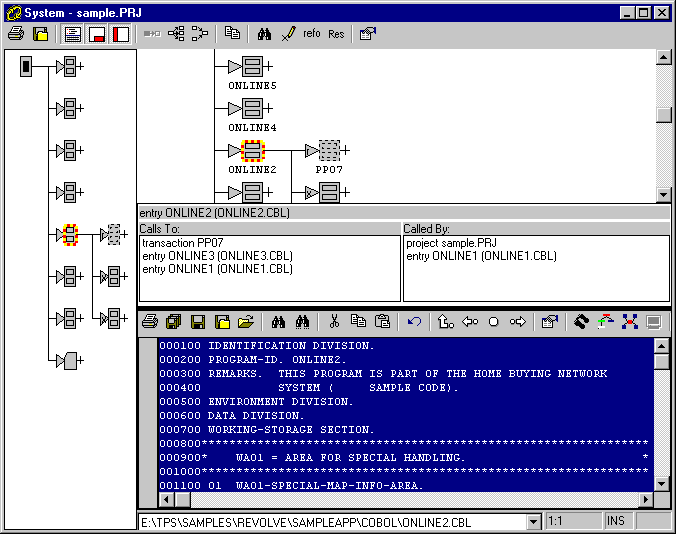 The System view provides a graphical depiction of the relationships between entities (JCL jobs, COBOL programs, data files, et cetera.) in a project. In addition to the graphical icons, detailed information about each relationship is also provided.