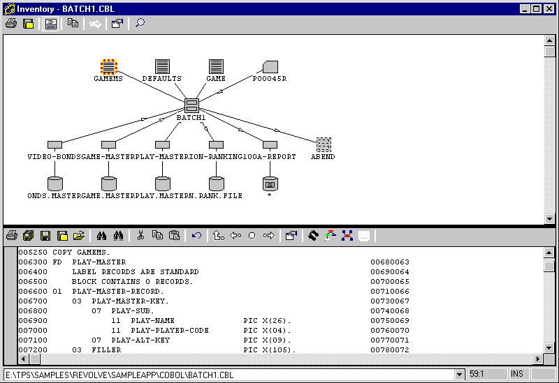 The Inventory for COBOL programs shows the main program, copybooks/includes, files, databases, screens, programs called, and entities invoking the main program.