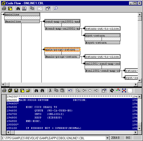 The Code Flow view displays a flow chart that illustrates the calling hierarchy of the paragraphs and sections in a COBOL program or entry point. The flow chart shows GO TO statements, PERFORM statements, CICS error handlers and fall throughs in relation to the paragraphs and sections in the program.