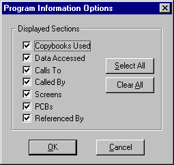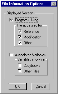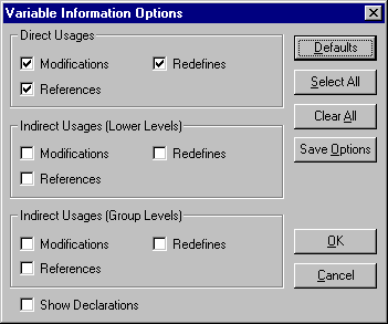 All direct redefines, direct references, and direct modifications of the specified variable will be set by default in the Variable Information Options dialog. In addition to the default criteria you can modify the specifications to include information about other variables that are related to the specified variable. You have the following options: