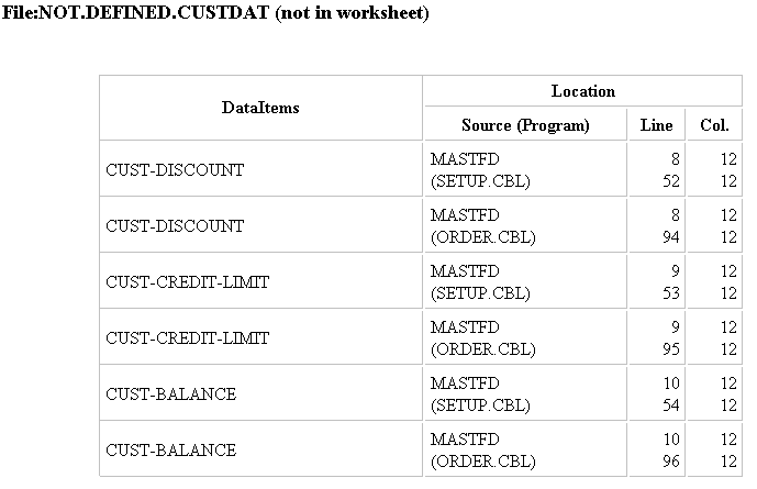 The sample above shows the location of the definition for each data item and the first statement using it.