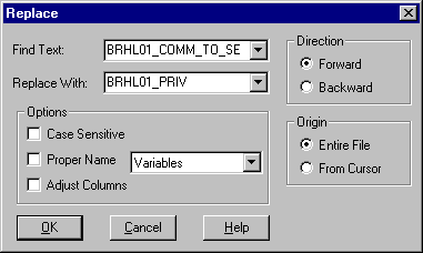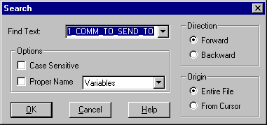 Opens the Search dialog where text strings can be specified and located in the source code. |
