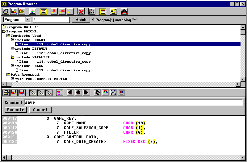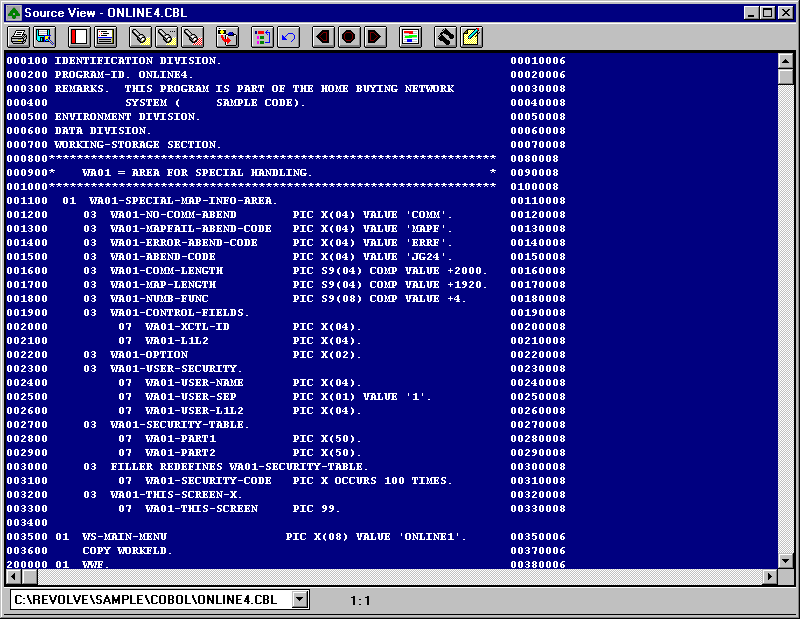 The Source view creates a logical view showing all the integrated files that comprise a module. For a COBOL program, the copybooks and include files are interleaved in the main source file. For JCL, a logical view that integrates all the proclibs with the main job is shown. The Source view displays the source code as it would appear in its source file format. The overview window runs along the right side of the view and provides a representation of the source file. The selected item's location appears as a horizontal bar in the overview window. Highlighted items will also be displayed in their appropriate color in the overview window.