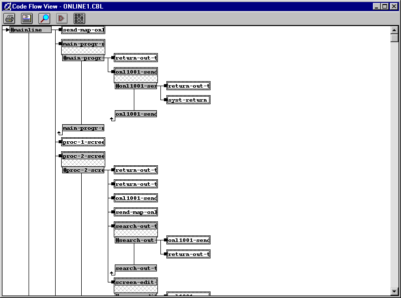 The Code Flow view is a graphical way to view the components of a COBOL program. Interpretation can be difficult unless you understand the significance of the symbols used to create the code flow view.