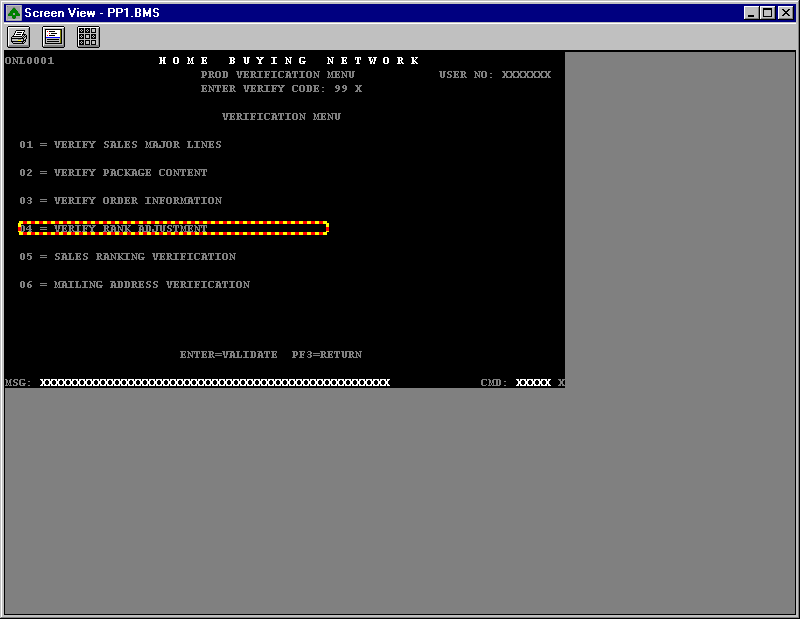 The Screen view creates an image of the BMS or MFS screen as it would be displayed in a production system. Uninitialized fields are shown with "X"s, or "9"s if numeric.