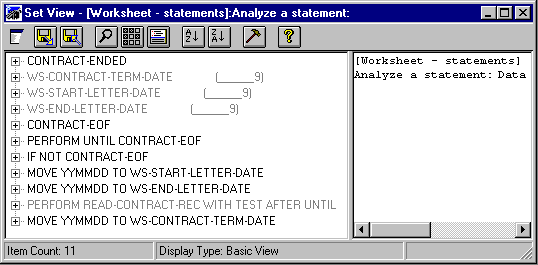 Many of the statements are relatively straight forward to understand and establish whether they are a problem or not. Sometimes, however, a statement has wider implications because of the data items it uses and the way those data items are used elsewhere. To help in these situations, the Analyze a statement analysis tool produces a set of all the data items and statements associated with the statement in question.