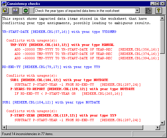 This produces a report of the inconsistencies and a set of the statements that contain data items with mismatched year types. The report is shown in Figure 8-1.