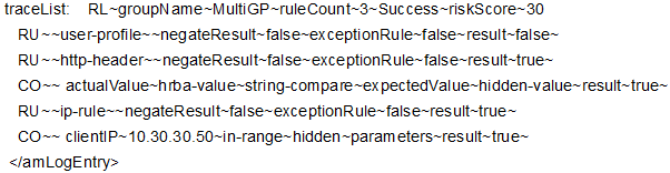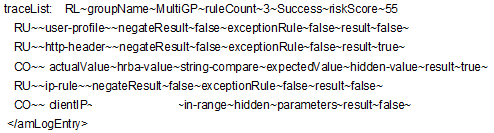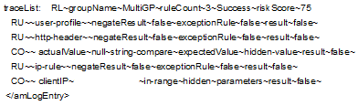 The following tracelist detail from catalina.out file provides more information about the rule evaluation, risk score, and action: