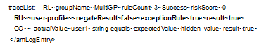In this scenario, all rules fail to evaluate successfully. The following tracelist detail from the catalina.out file provides more information about the rule evaluation, risk score, and action: