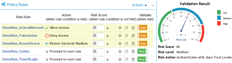 Now, open the risk policy for which you want to emulate total risk score, risk level, and action in event of rule failure. In the risk policy page, click Actions > Toggle Validate. Specify the rules as pass or fail to see the result along with a graphical representation.