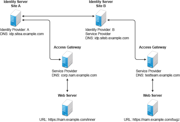 In this configuration, Site A is identity provider for the corporate resources, and the employees authenticate to this site and have access to the resources on the web server with the URL of https://nam.example.com/inner.
