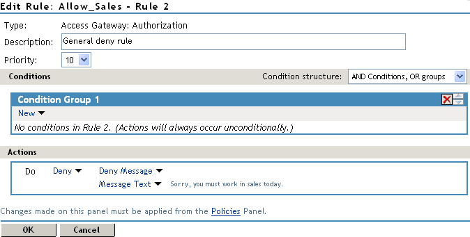 Click Message Text, then in the text box, type the deny message: Sorry, you must work in sales today.