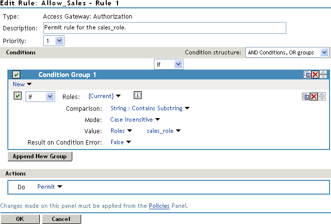 With no conditions in the condition group, this creates a general deny rule that matches everyone. The users who have been assigned the sales role match the first rule that is processed. Everyone else matches this general deny rule.