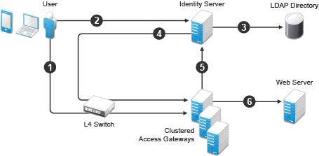 The user requests access to a protected resource by sending a request to the L4 switch. The request is sent to one of Access Gateway servers in the cluster.
