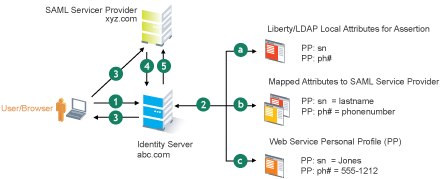 Because the identity provider must interoperate with other SAML service providers that probably do not use consistent attribute names, you can map the service provider attributes to your Liberty and LDAP attributes on Identity Server. In this example, the service provider names for the Liberty PP: sn and PP: ph# attributes are lastname and phonenumber, respectively. (See Configuring the Attributes Obtained at Authentication.)