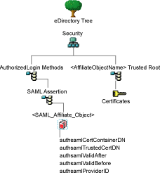 If the schema has been extended correctly, you can find a SAML Assertion object in the Authorized Login Methods container. The SAML_Assertion object contains an alphanumeric generated name for a SAML affiliate object. This object has four attributes.