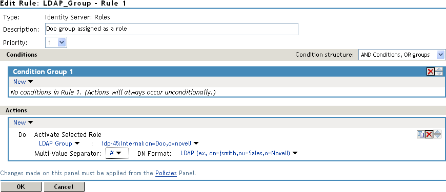 You can now use the cn=Doc,o=novell role when creating Authorization and Identity Injection policies, which control access to protected web resources. Roles activated this way do not appear in the list of available roles. You need to use the Data Entry Field to manually type in the role name. For more information, see the following: