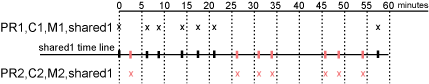 The user first logs in to PR2 and is active for 10 minutes. The shared1 time line gets updated with this activity. When the user requests access to PR1, the user is granted access without being prompted for credentials. The user is then active on PR1 for over 20 minutes. When the user requests access to PR2, even though the user has been inactive on this resource for over 20 minutes, the user is granted access because the time line shows activity within the last five minutes.