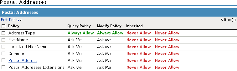 If you click the Postal Address attribute, you can see that all of its child attributes have inherited the Never Allow setting. You can specify different permission attributes for Address Type (for example), but the inherited policy still overrides changes made at the child level.