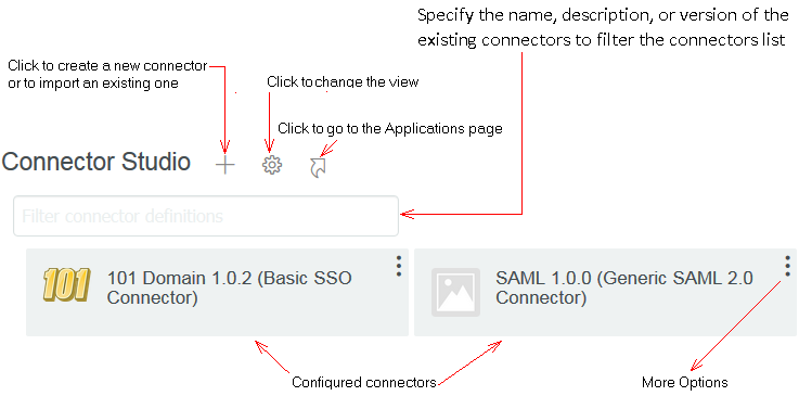 The Connector Studio page provides options for changing view size, switching to the Applications page, and redirecting to Dashboard.