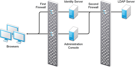 It is recommended to use Access Manager with firewalls. Figure 1-10 illustrates a simple firewall setup for a basic Access Manager configuration of an Identity Server, an Access Gateway, and an Administration Console. This is one of many possible configurations.