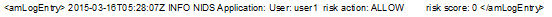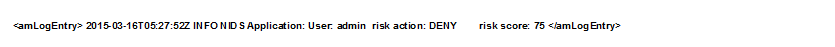 This log entry indicates that as per the risk level/action configuration, the action is to deny access to the user and the risk score is 75.