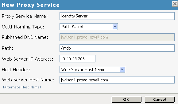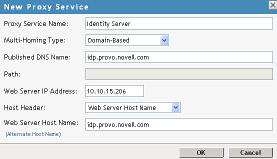For example, if the proxy service name is jwilson1.provo.novell.com, replace jwilson1 with idp so that the domain name is idp.provo.novell.com.