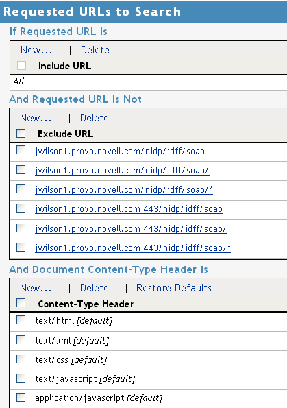 Specify the following URLs in And Requested URL Is Not. The following URLs use jwilson1.provo.novell.com/nidp as the DNS name of the proxy service for Identity Server. This is the example name for the path-based proxy service.