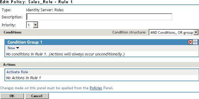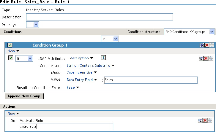 In the Actions section, click New > Activate Role, then specify sales_role in the Do Activate Role field. Your rule must look similar to the following: