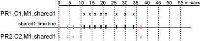 The user first logs in to PR2 and is active for 10 minutes. The shared1 time line gets updated with this activity. When the user requests access to PR1, the user is granted access without being prompted for credentials. The user is then active on PR1 for over 20 minutes. When the user requests access to PR2, even though the user has been inactive on this resource for over 20 minutes, the user is granted access because the time line shows activity within the last five minutes.