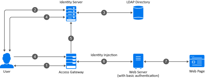 A typical Access Manager configuration includes an Identity Server with LDAP directories and an Access Gateway with a protected web server. Figure 2-5 illustrates the process flow that allows an authorized user to access the protected resource on the web server.