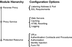 When you set up Access Gateway to protect web resources, you need to create and configure reverse proxies, proxy services, and protected resources. The following figure illustrates the hierarchy of these modules and the major configuration tasks you perform on each module.