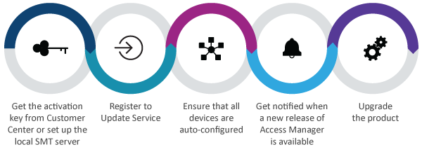 After successful synchronization of registration information into Administration Console, in the Access Manager 5.0 Service Pack 2 or later, you can use Upgrade Assistant to receive future Access Manager release updates and to update devices to the latest Access Manager version.